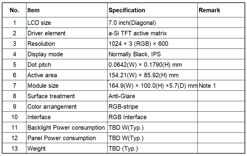 De 7,0-inch TFT LCD-module, aangestuurd door een a-Si TFT actieve matrix, heeft een resolutie van 1024x3(RGB)x600. Het scherm werkt in een 'normally black'-modus met IPS-technologie, wat zorgt voor een brede kijkhoek. Een antireflectiecoating helpt schittering op het scherm te verminderen, terwijl de RGB-streepindeling de kleurweergave verbetert. Een RGB-interface zorgt voor een betere signaal- en gegevensoverdracht.
